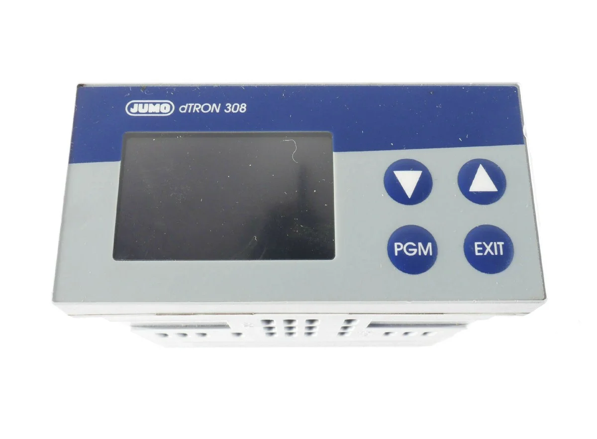 کنترلر JUMO dTRON 308 با تغذیه 110-240 ولت یک کنترلر صنعتی با ورودیهای متنوع، خروجیهای آنالوگ و رلهای، نمایشگر LCD و الگوریتم PID برای کنترل فرآیندهاست.