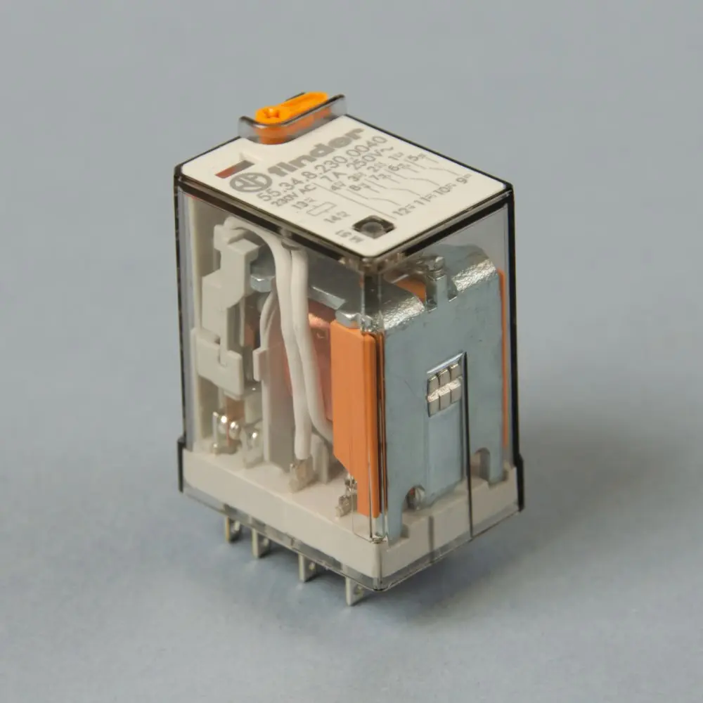 رله 553482300040 فیندر 4 کنتاکت 7 آمپر ولتاژ 230 ولت AC. طراحی فشرده، نصب سوکت 9404. مناسب برق صنعتی و اتوماسیون صنعتی و تجهیزات صنعتی. رله فرمان finder