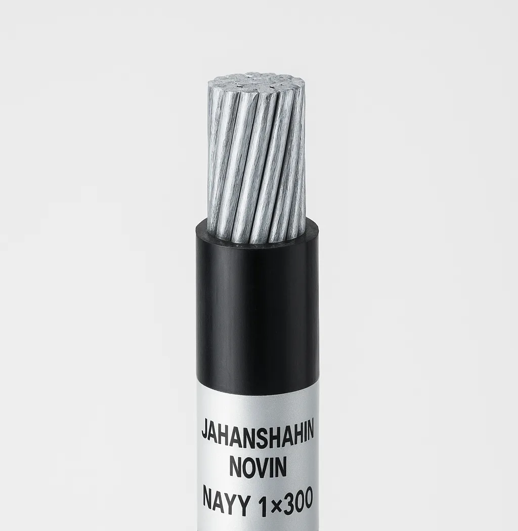 کابل آلومینیوم ۱×۳۰۰ جهان شاهین نوین NAYY، تکرشتهای با هادی آلومینیومی و روکش مقاوم، مناسب شبکههای توزیع، تابلو برق و پروژههای صنعتی.